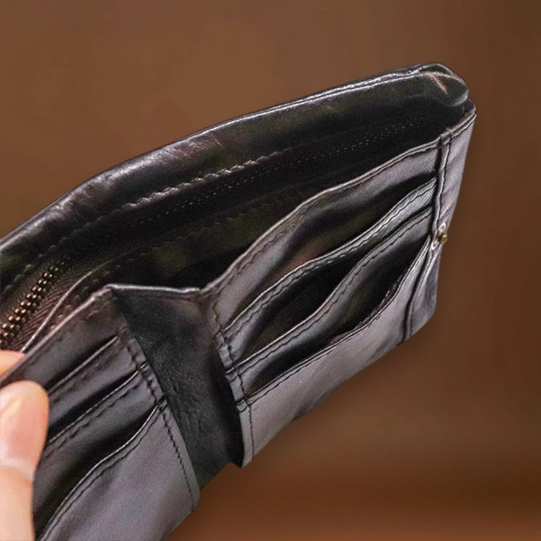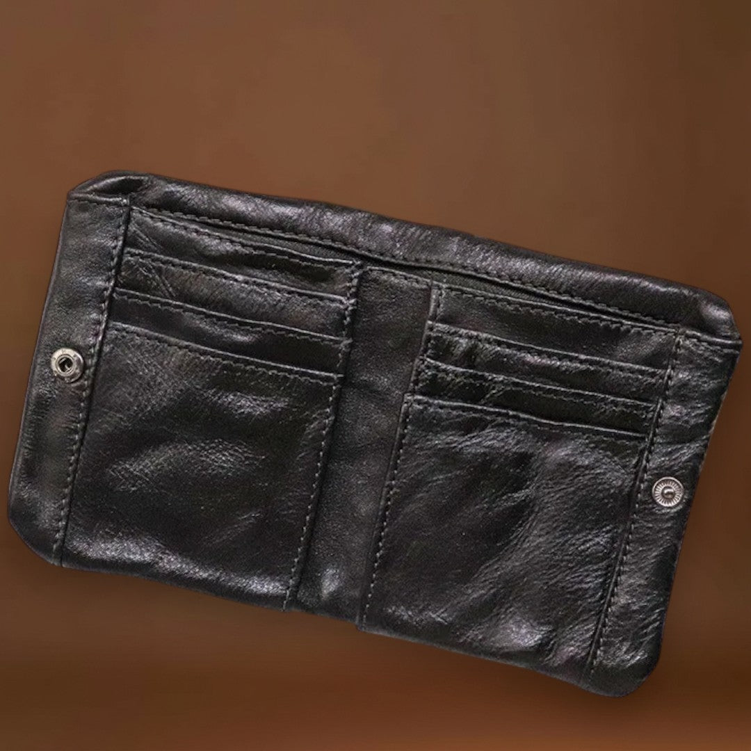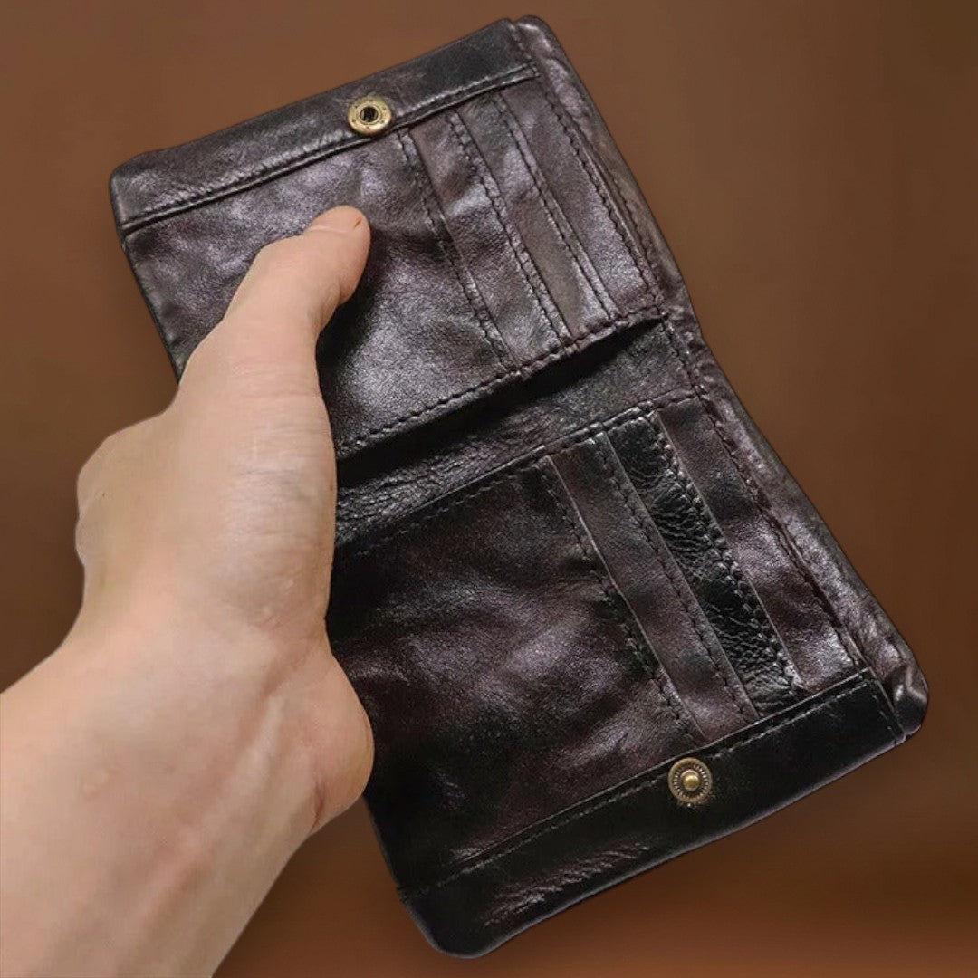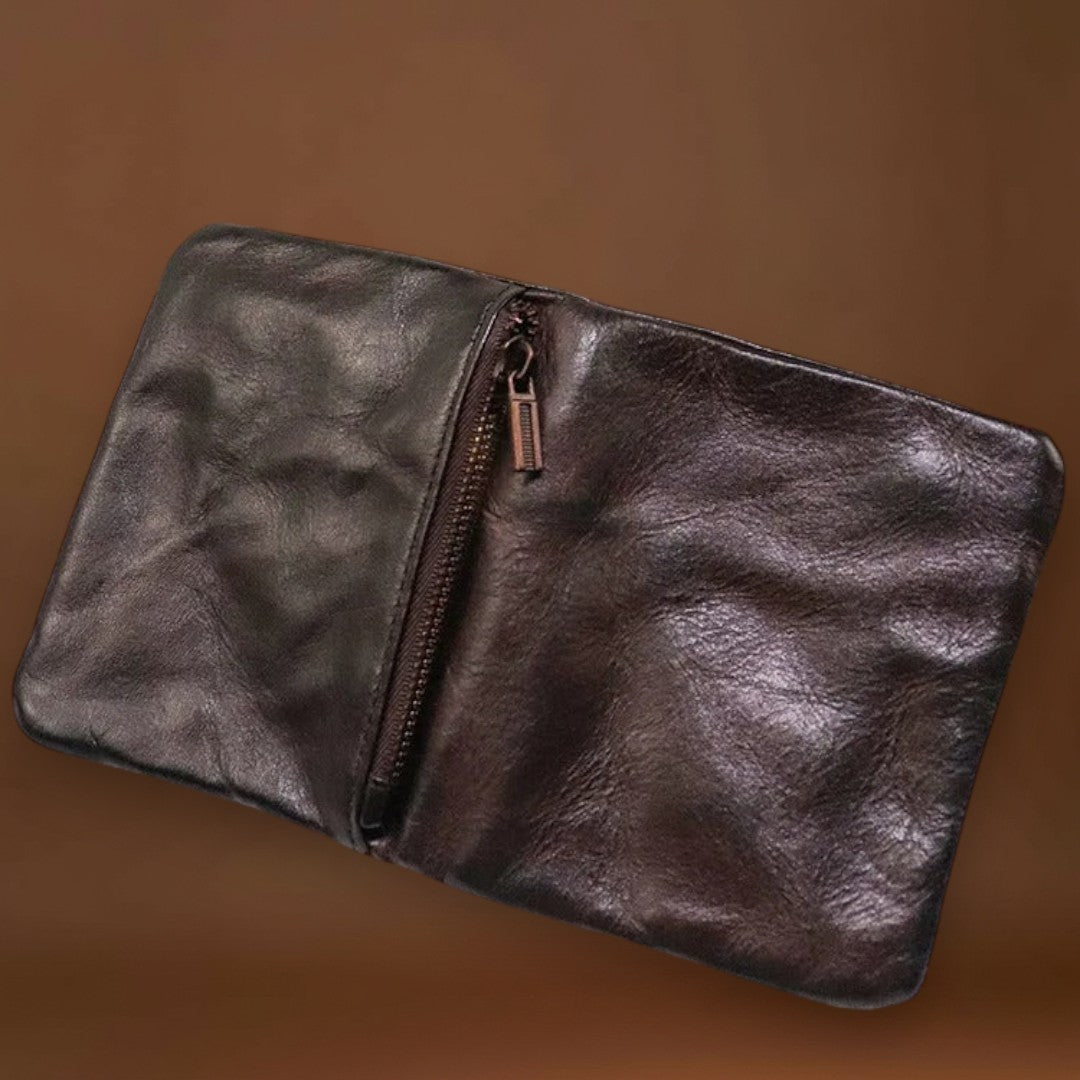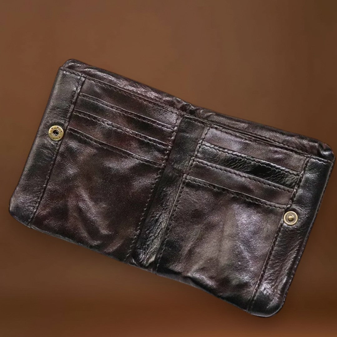Esta carteira já parece que é sua há anos—da melhor maneira possível. Feita de couros macio e usado à mão, dobra-se e molda-se com facilidade, adaptando-se ao seu bolso desde o primeiro uso. O estilo robusto e vivido combina perfeitamente com denim e flanela, trazendo autenticidade casual aos seus itens essenciais do dia a dia.