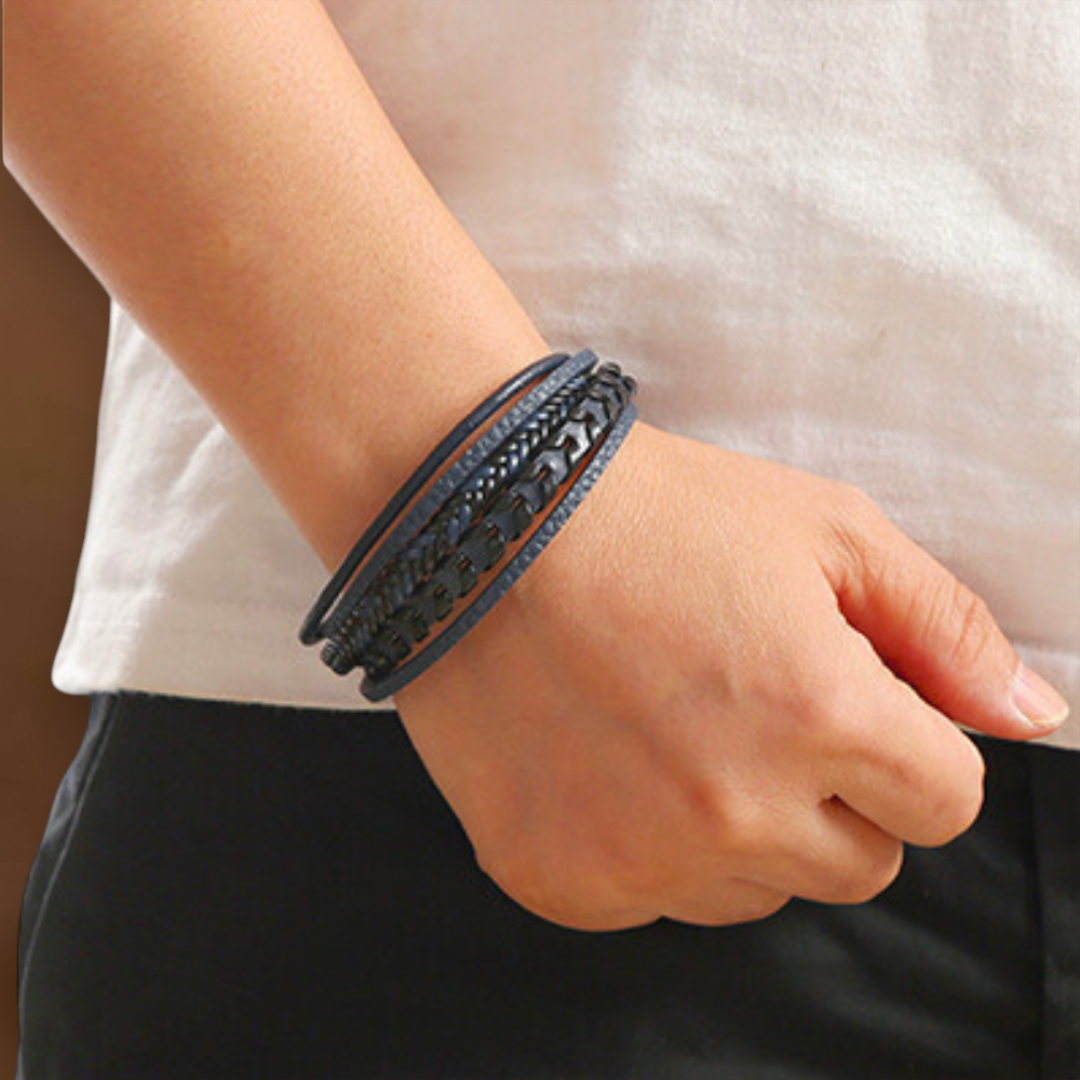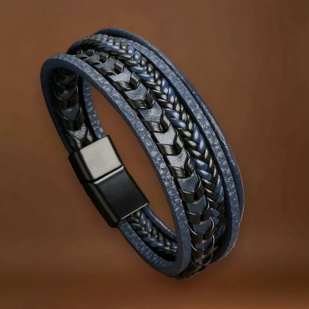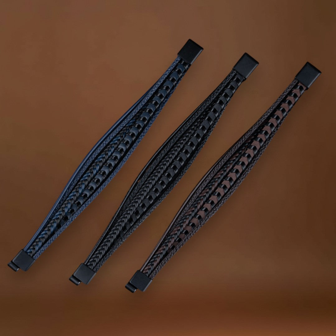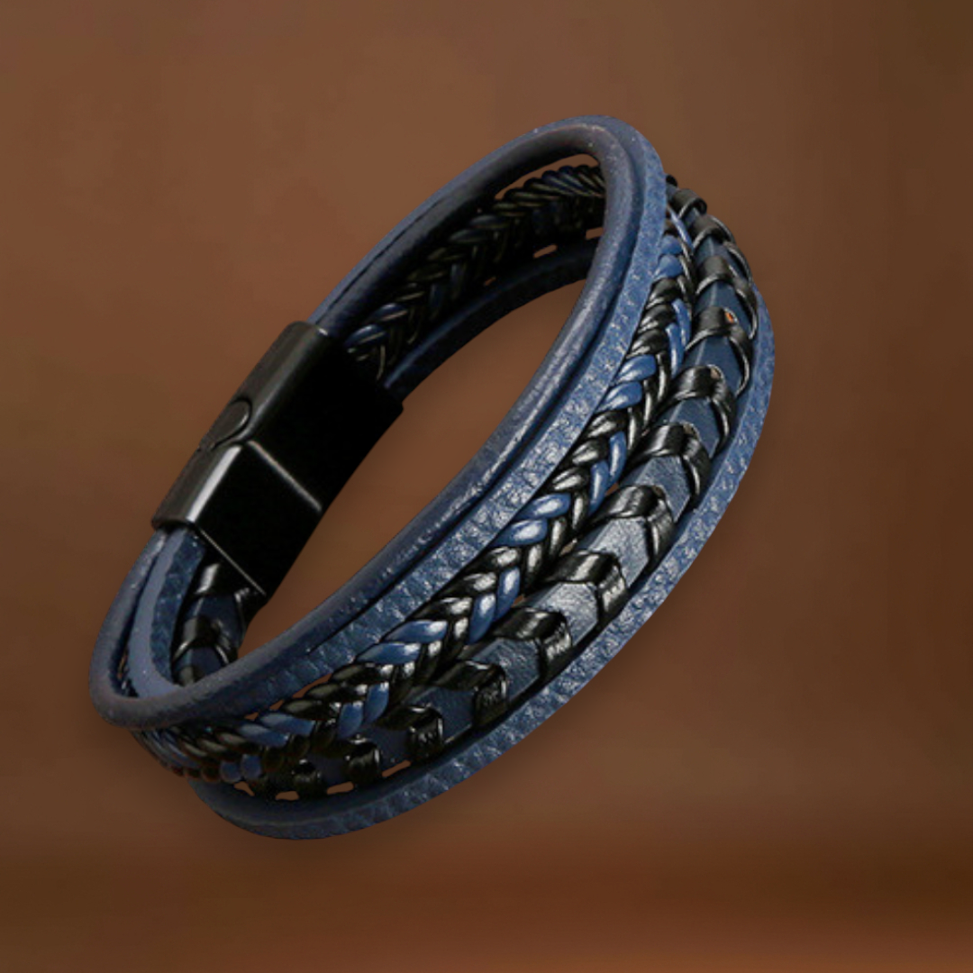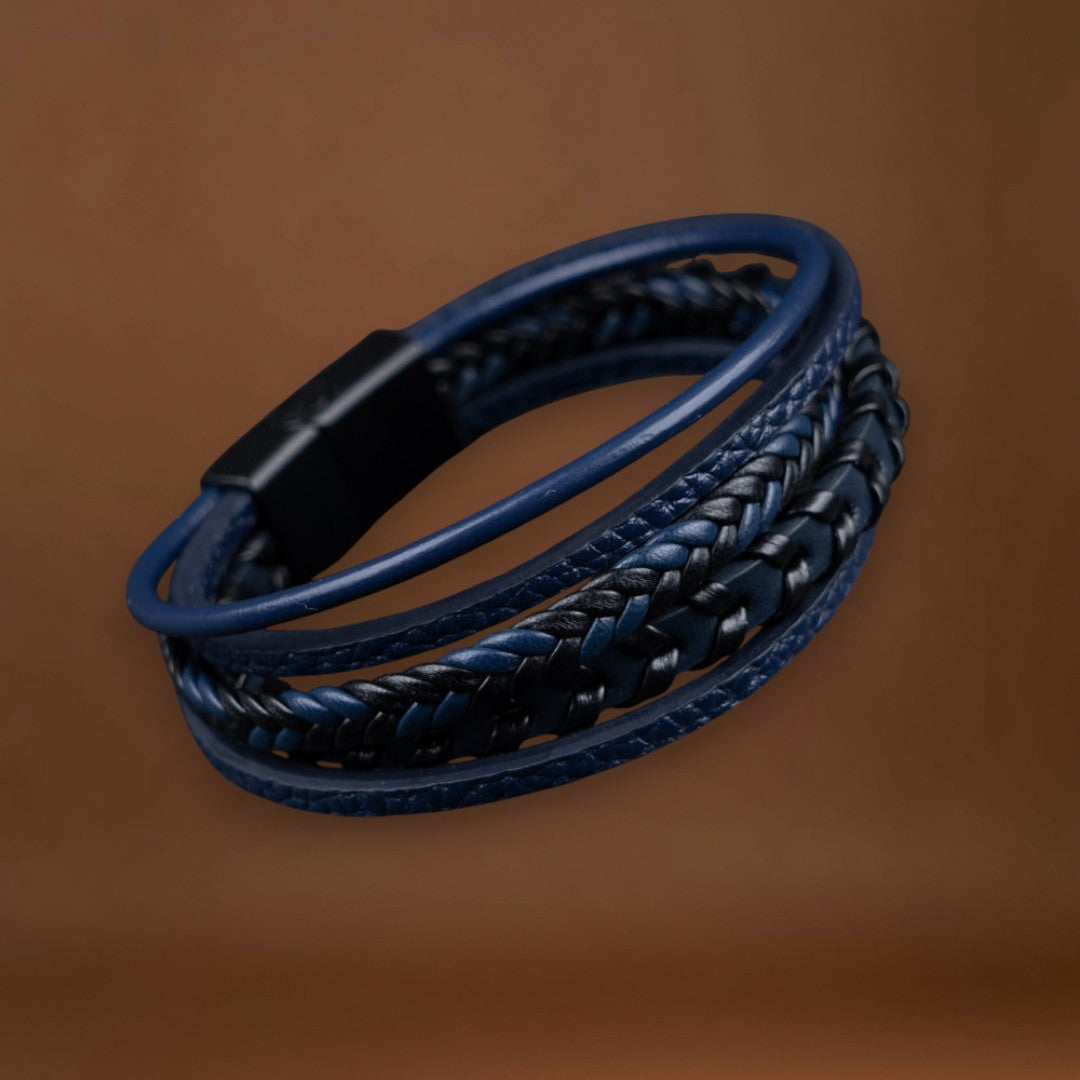• Design Trançado e em Camadas: Mistura de couro azul profundo e preto, perfeita para qualquer outfit.