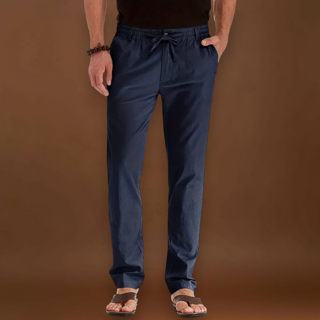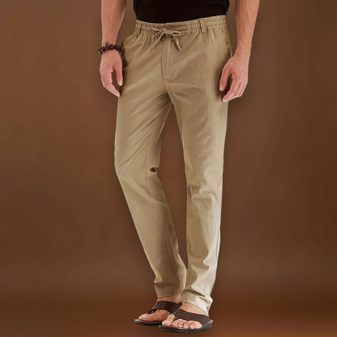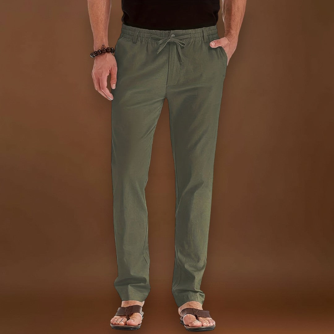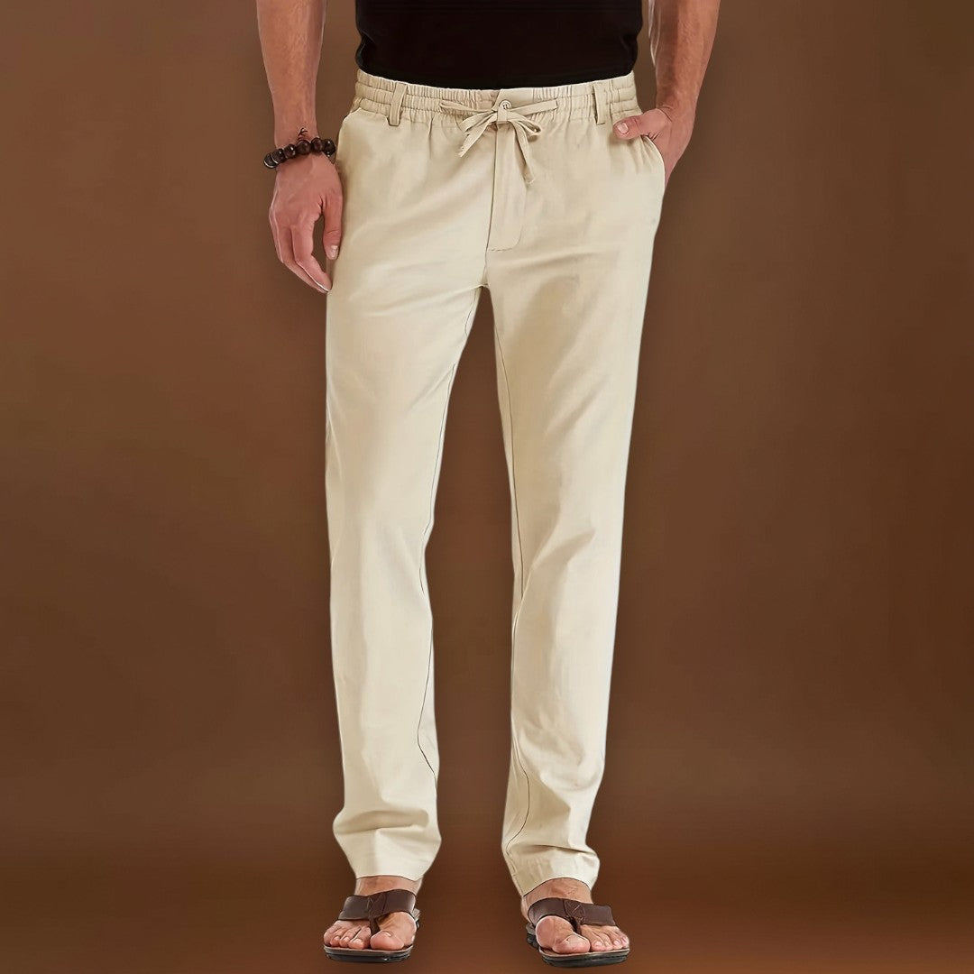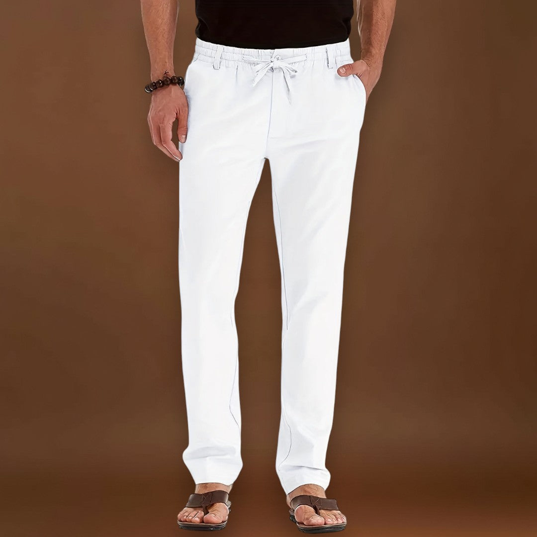 Estas calças casuais de verão oferecem conforto leve e facilidade de movimento. O tecido é uma mistura respirável que se sente suave contra a pele e permite a circulação de ar. O corte relaxado proporciona espaço nas ancas e coxas para reduzir a restrição ao caminhar ou sentar.