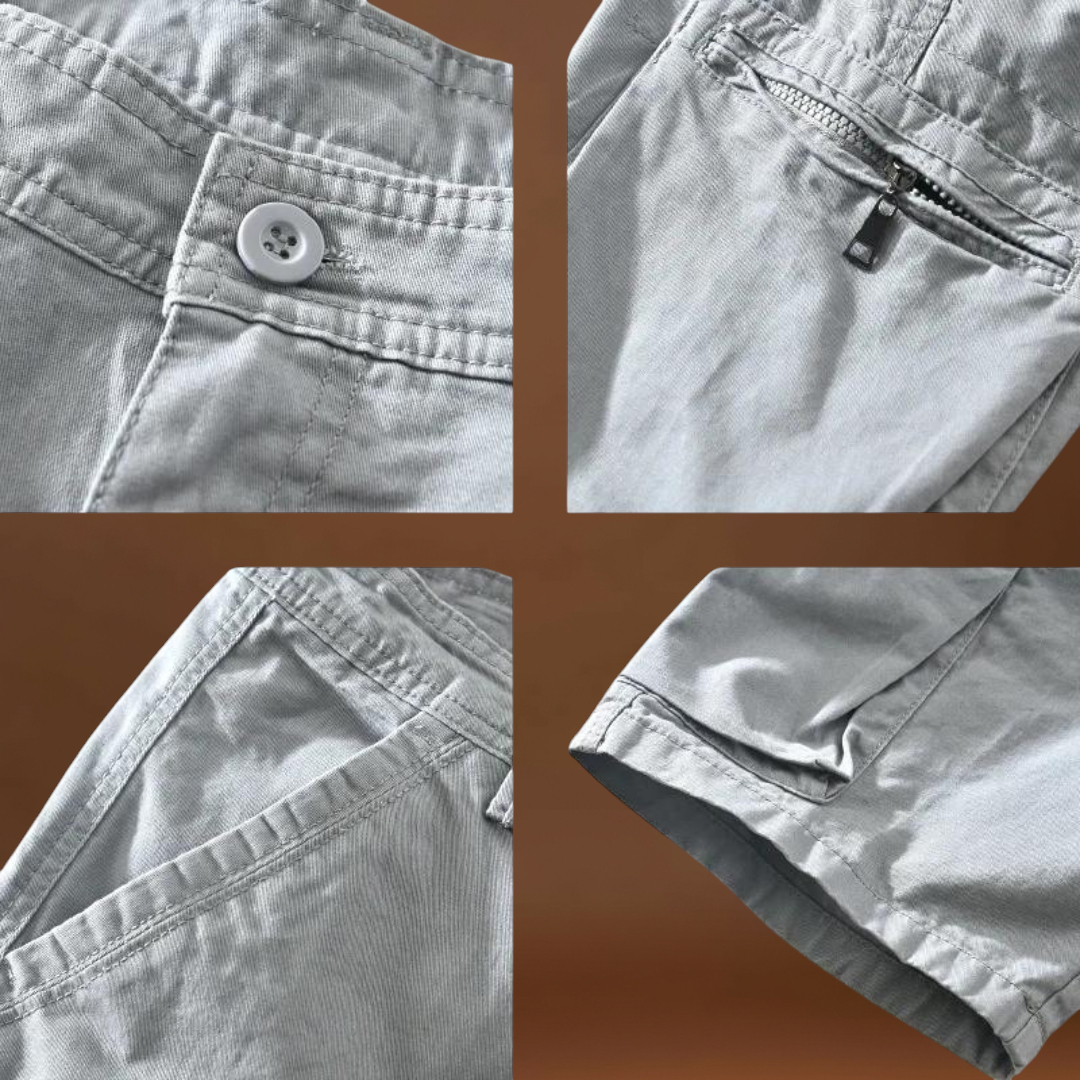 • Múltiplos bolsos: Dois bolsos frontais para as mãos, bolsos cargo em cada perna e dois bolsos traseiros oferecem armazenamento organizado para pequenos itens.