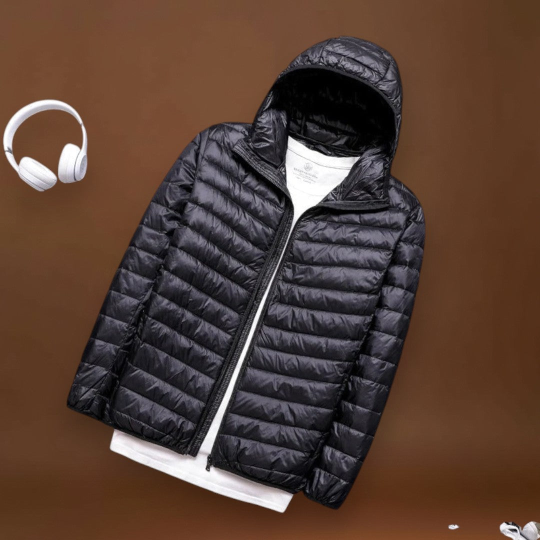 Os detalhes funcionais focam-se na facilidade de uso e proteção prática. O casaco oferece uma silhueta limpa e controles diretos para vestir e despir. A colocação dos bolsos e os métodos de fecho são destinados a manter pequenos itens seguros enquanto se está em movimento.