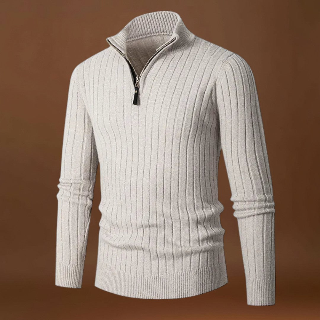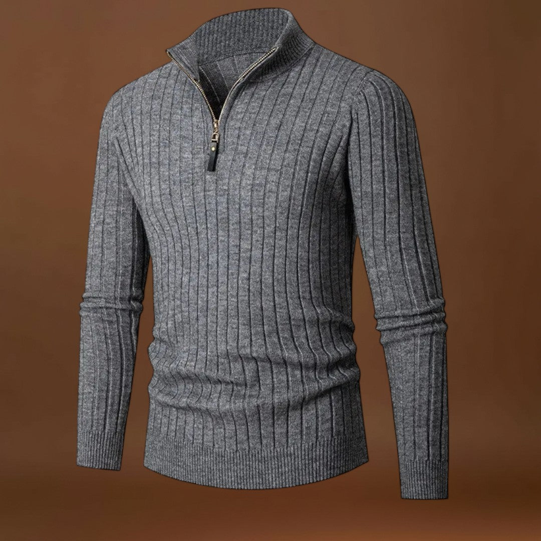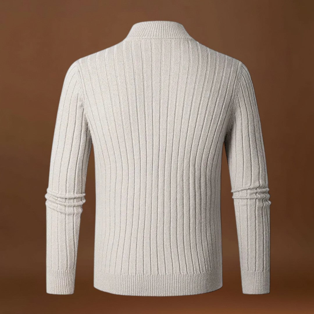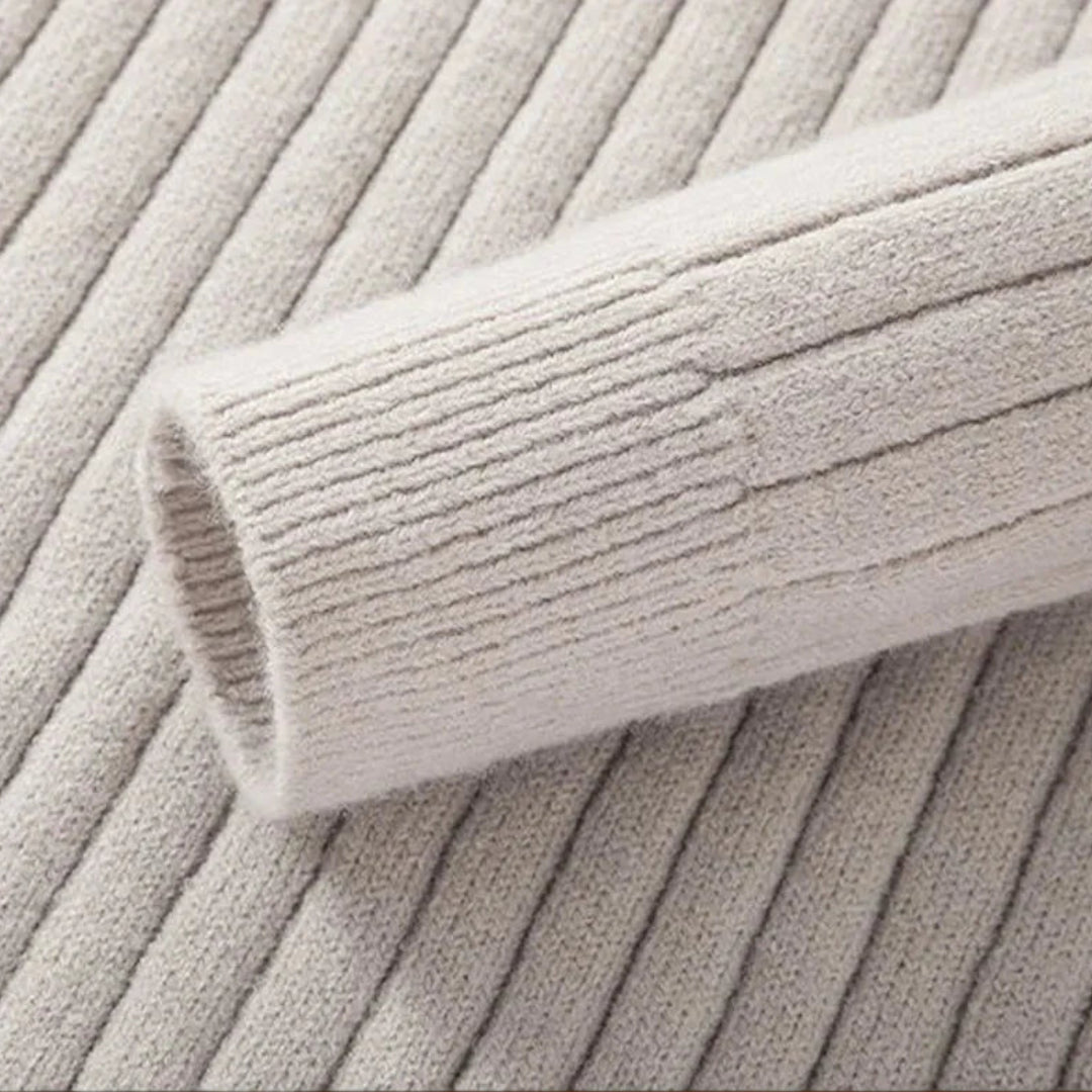 Este sweater de meio zíper oferece características claras e práticas num design simples. A mistura de fibras naturais fiadas proporciona uma textura suave e uma forma estável. As mangas longas e os punhos canelados ajudam a manter as mangas no lugar. A gola alta cobre o pescoço, e o meio zíper frontal permite ajustar rapidamente a abertura do pescoço.