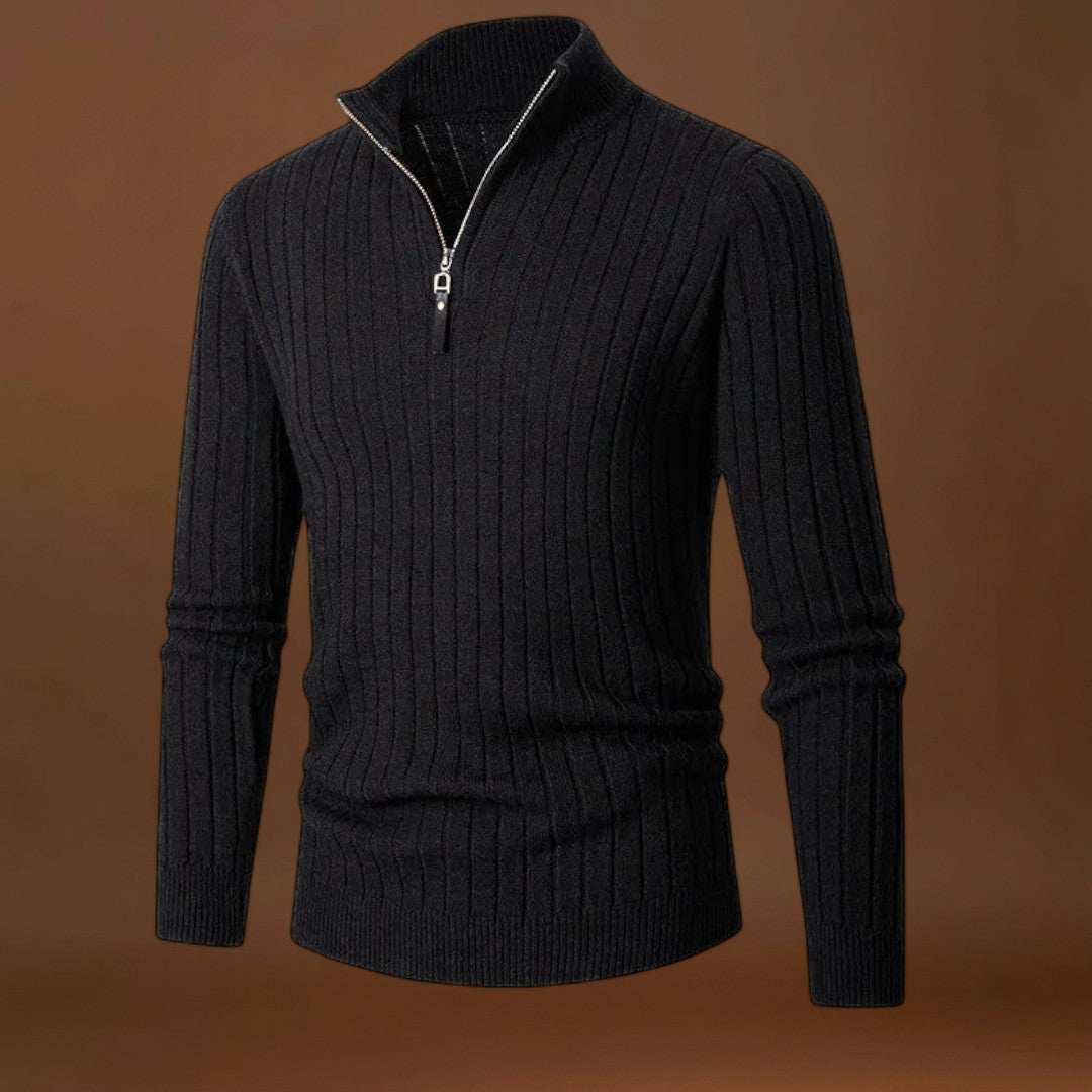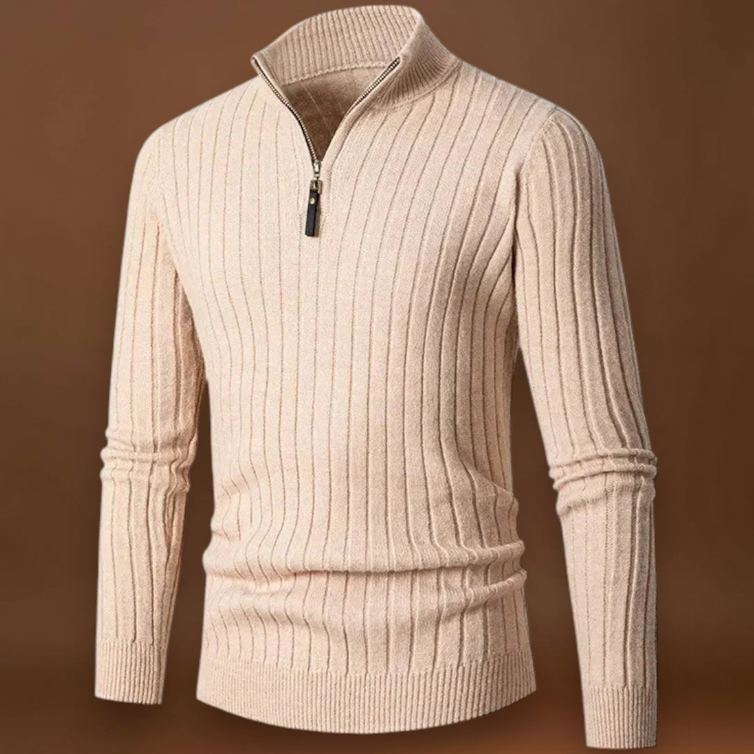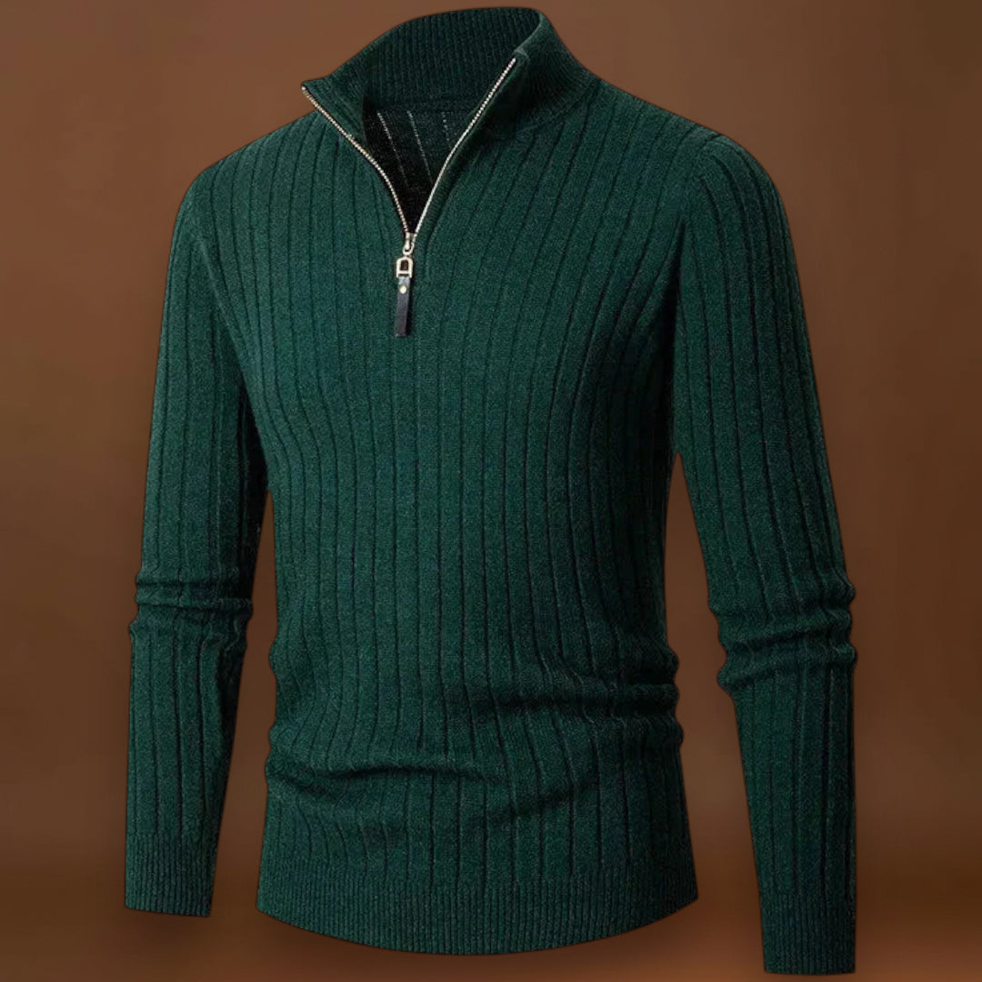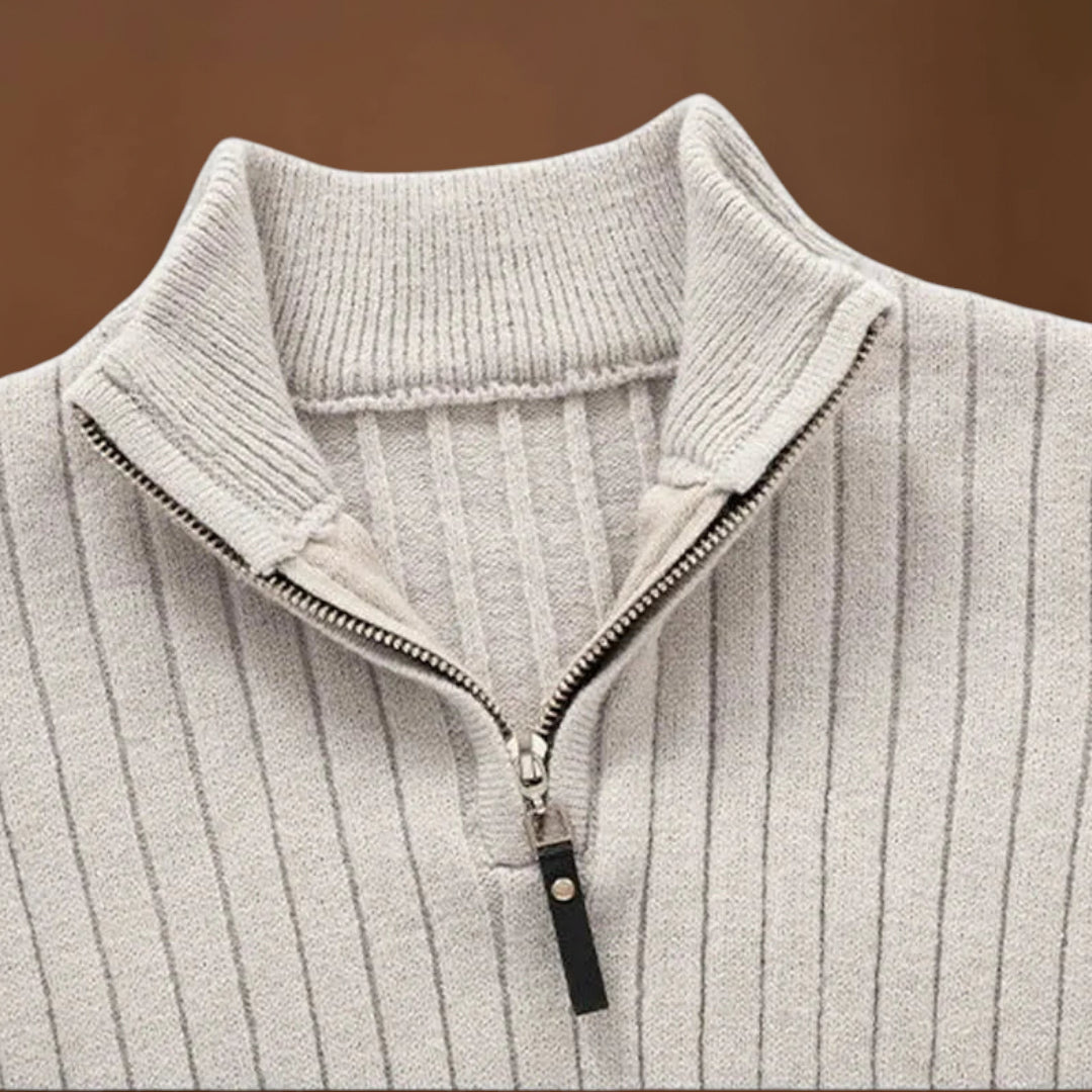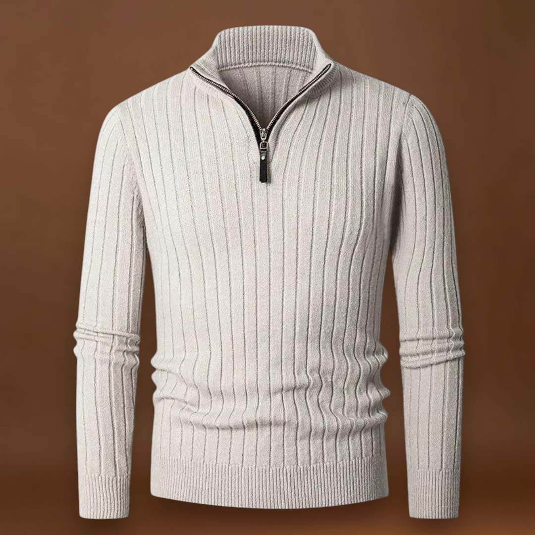 Este sweater de meio zíper oferece características claras e práticas num design simples. A mistura de fibras naturais fiadas proporciona uma textura suave e uma forma estável. As mangas longas e os punhos canelados ajudam a manter as mangas no lugar. A gola alta cobre o pescoço, e o meio zíper frontal permite ajustar rapidamente a abertura do pescoço.