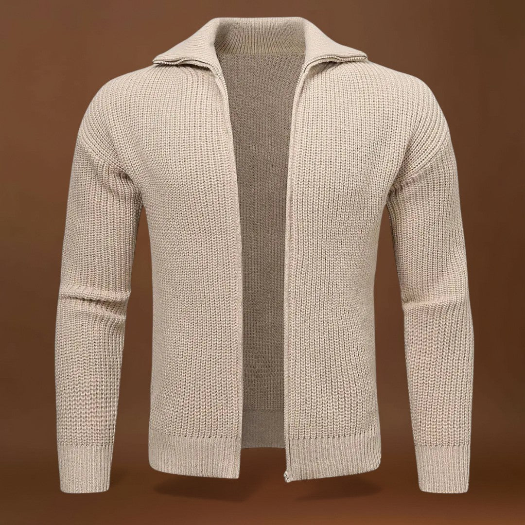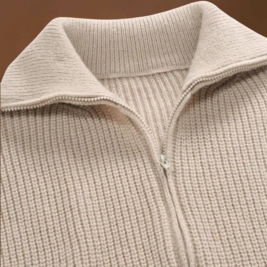 Este cardigã com zíper é feito de uma mistura suave e apresenta um padrão ribbed refinado numa tonalidade de castanho claro. O design foca em detalhes práticos que ajudam a tornar o vestir simples e confortável.