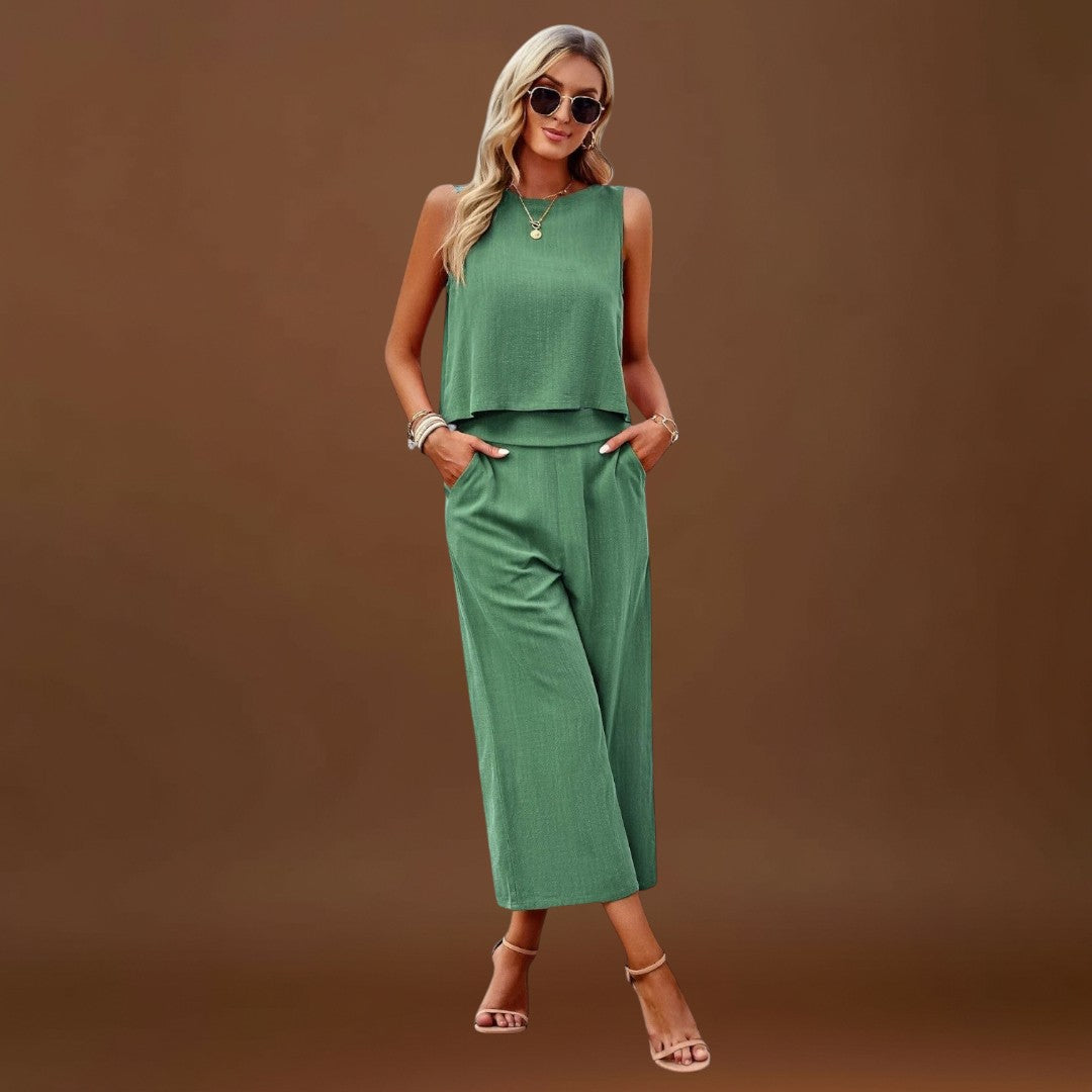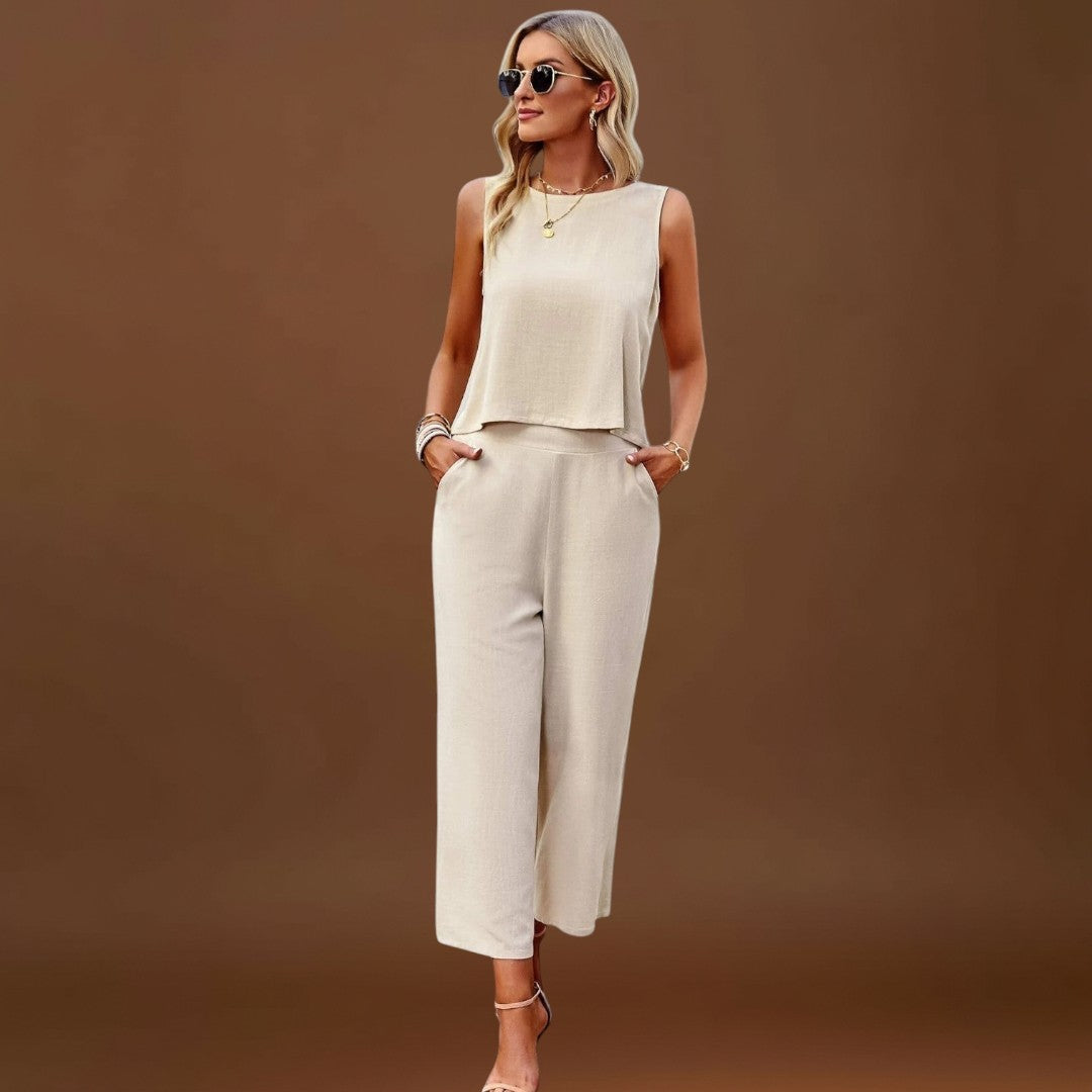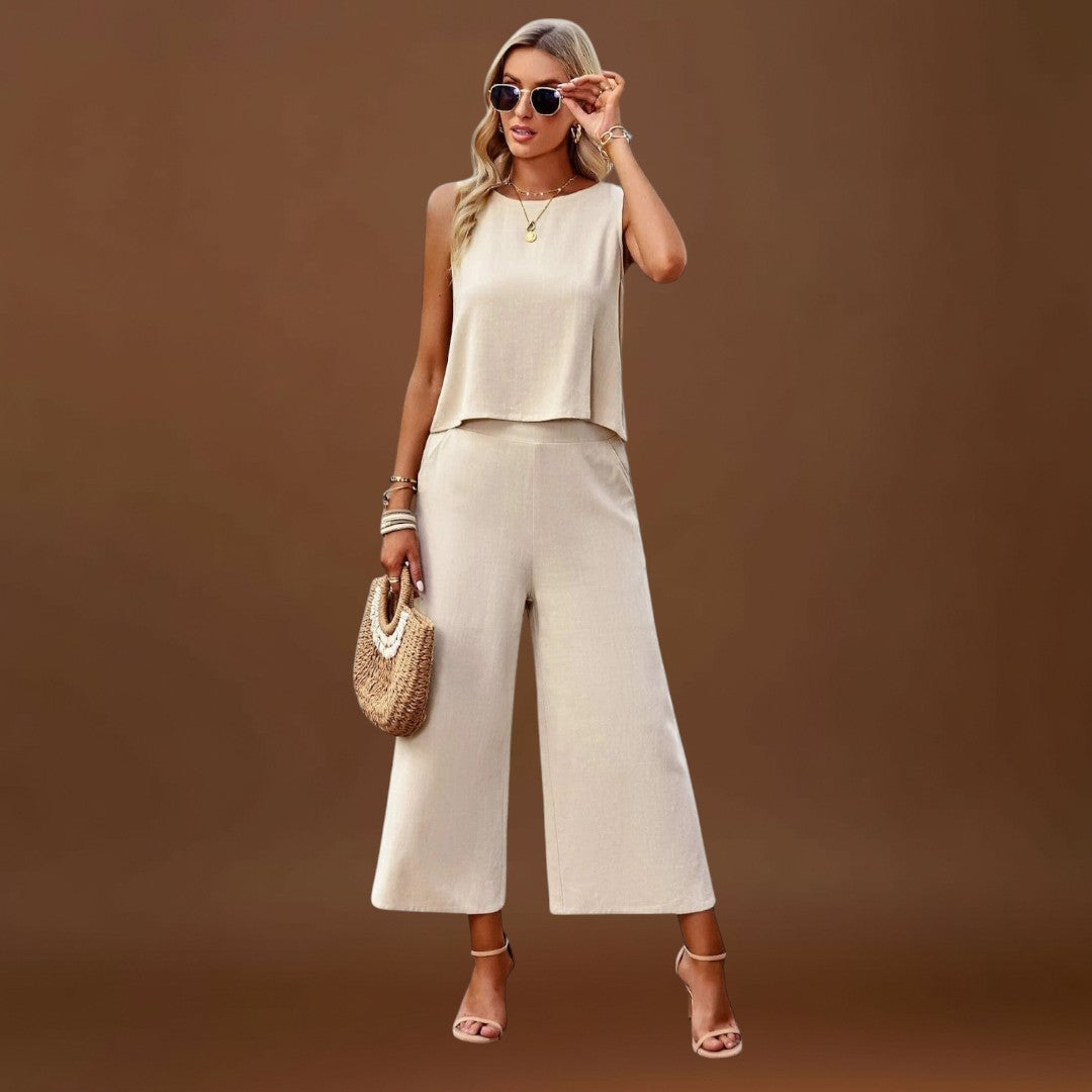 Este conjunto de linho é a escolha perfeita para quem valoriza elegância sem esforço. Com top sem mangas de corte reto e calça reta de cintura alta, ele entrega um visual moderno, fresco e extremamente confortável.
