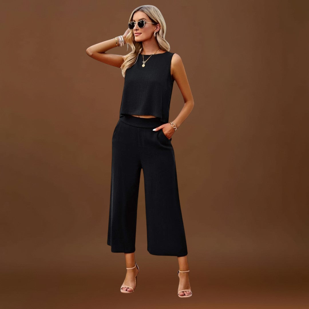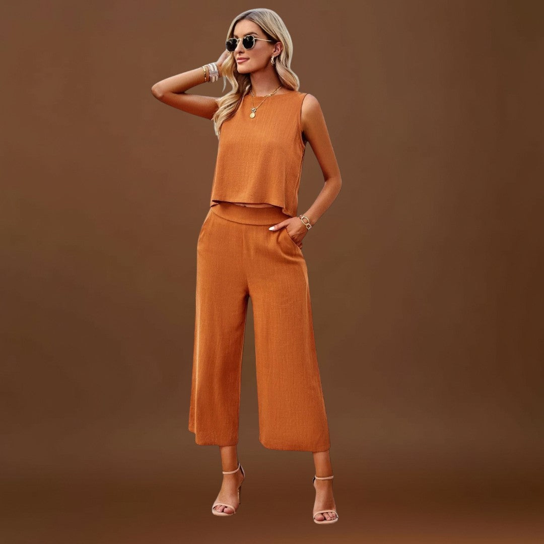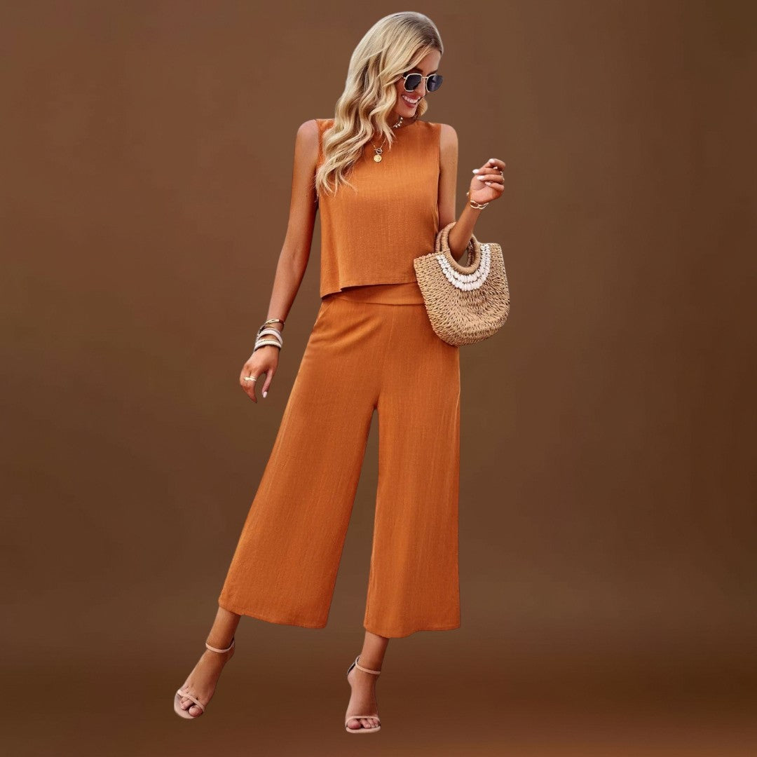 Este conjunto de linho é a escolha perfeita para quem valoriza elegância sem esforço. Com top sem mangas de corte reto e calça reta de cintura alta, ele entrega um visual moderno, fresco e extremamente confortável.