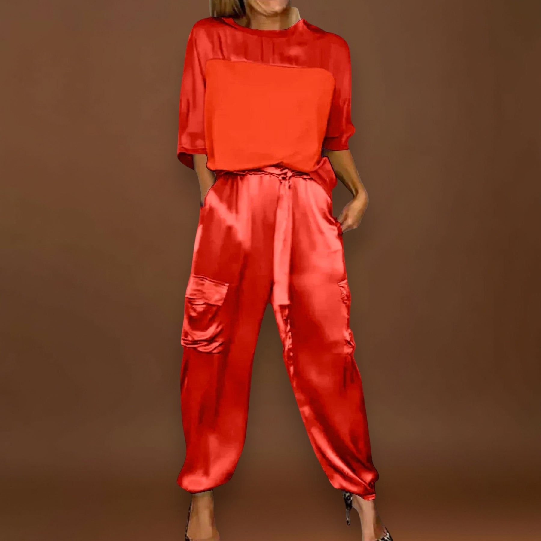 Feito com seda macia e respirável, este conjunto combina elegância e versatilidade, tornando-o ideal tanto para o uso diário como para saídas à noite. A blusa de meia manga adiciona sofisticação, enquanto as calças de corte solto garantem máximo conforto e liberdade de movimento.