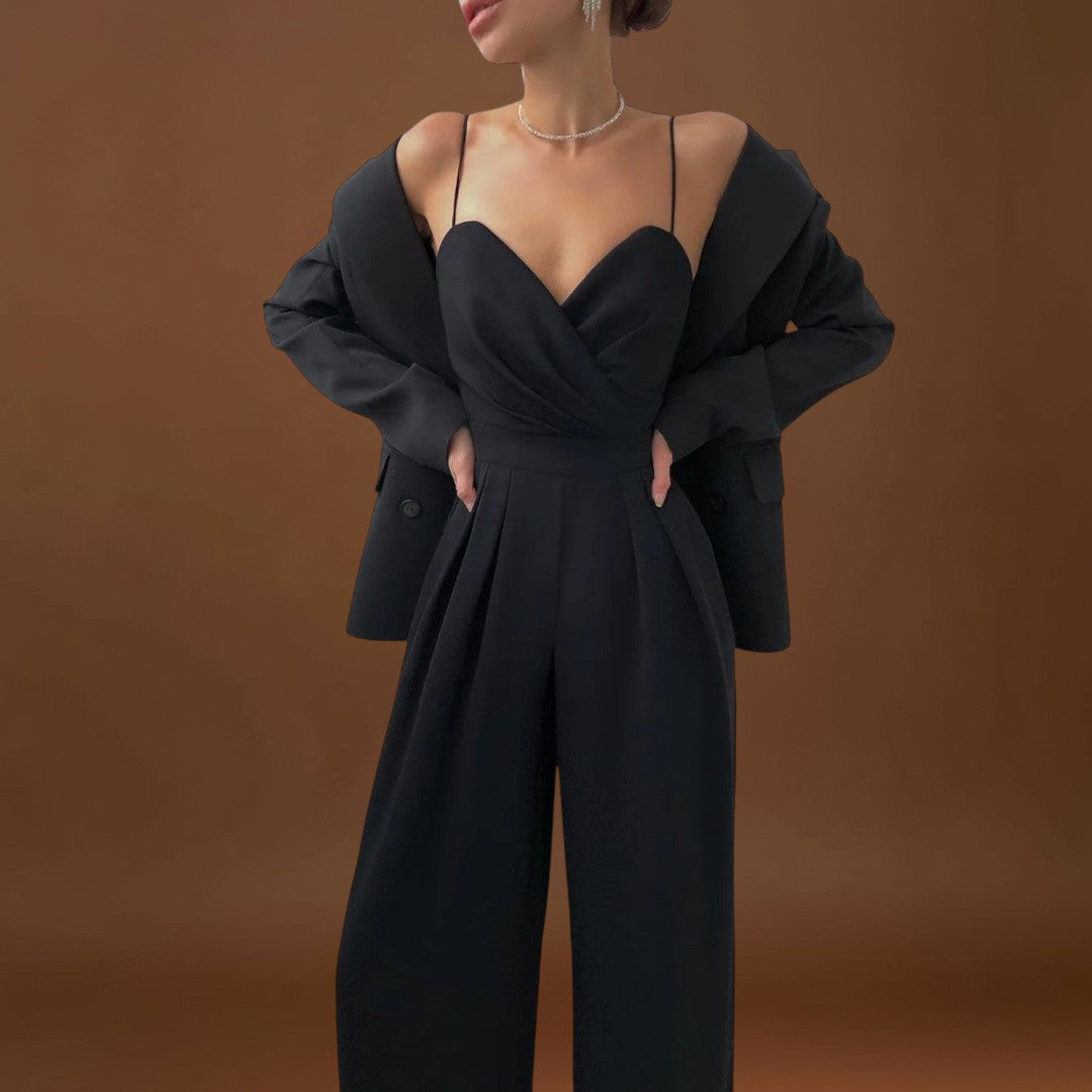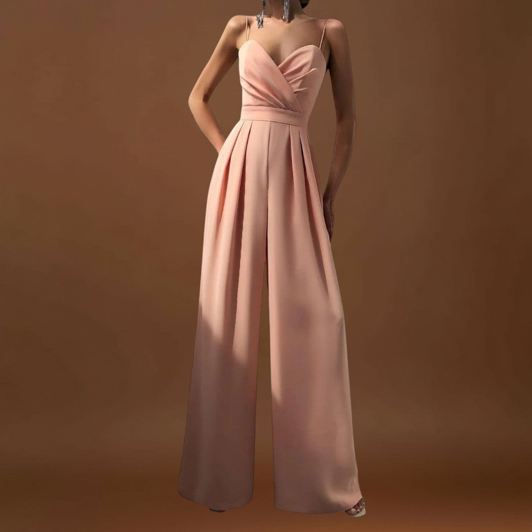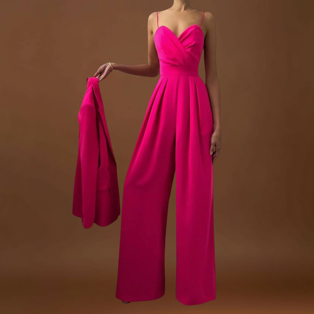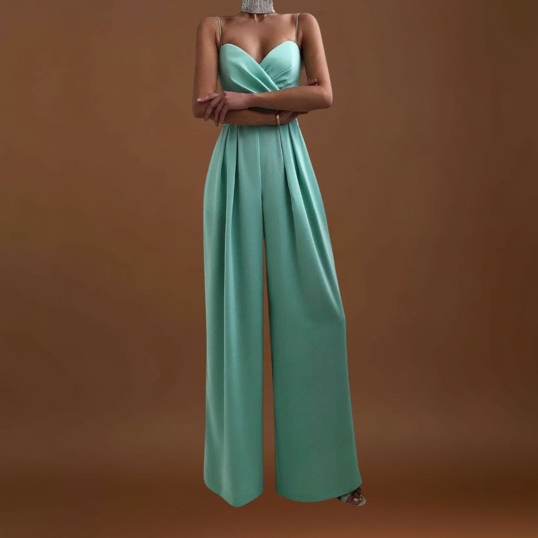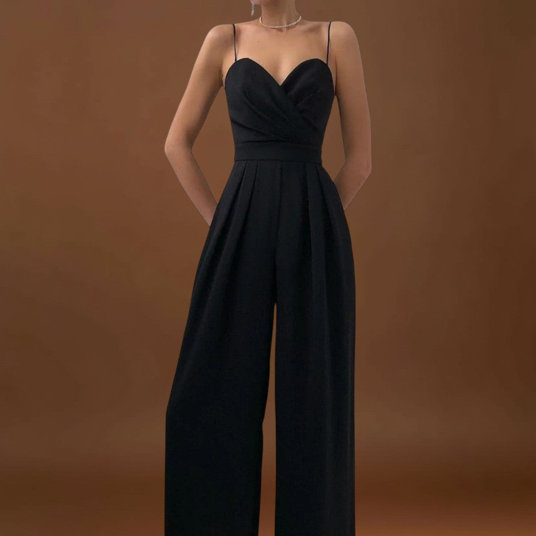 Este macacão comprido com alças finas e um decote cruzado é a escolha ideal para quem procura sofisticação com um toque moderno. Com uma cintura definida realça a figura e dá presença a qualquer ocasião - desde jantares formais a celebrações especiais. O seu design minimalista torna-o uma peça versátil, fácil de combinar com acessórios arrojados ou discretos, dependendo do seu estilo.