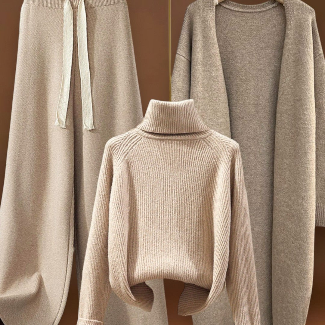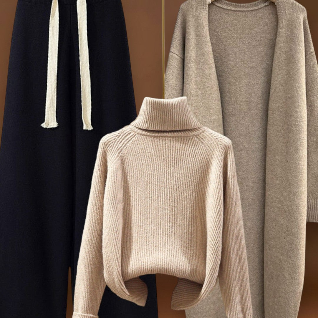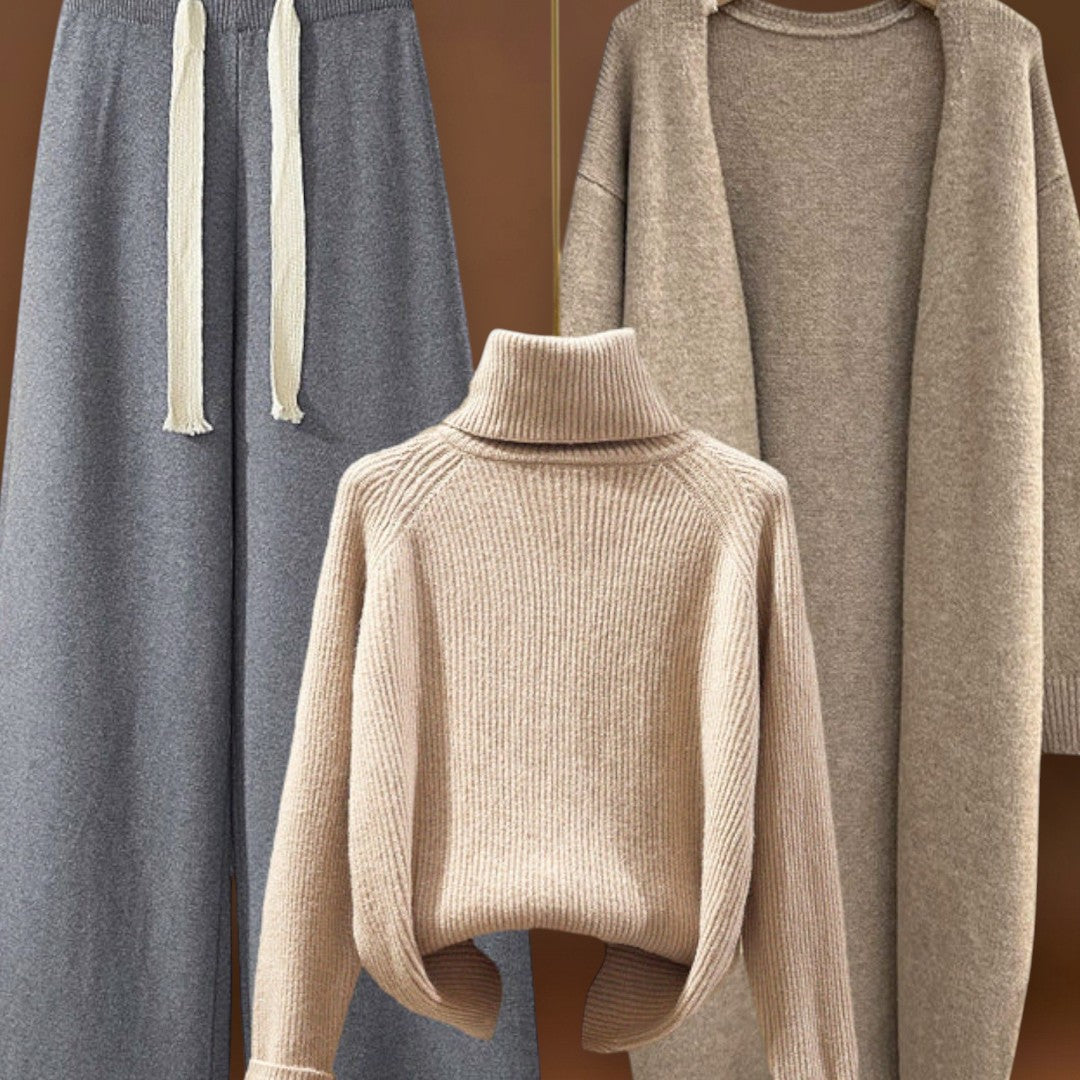 • Conjunto completo de 3 peças – Inclui um suéter de gola alta, um cardigã longo e uma calça de cintura alta e perna larga para um look harmonioso.
