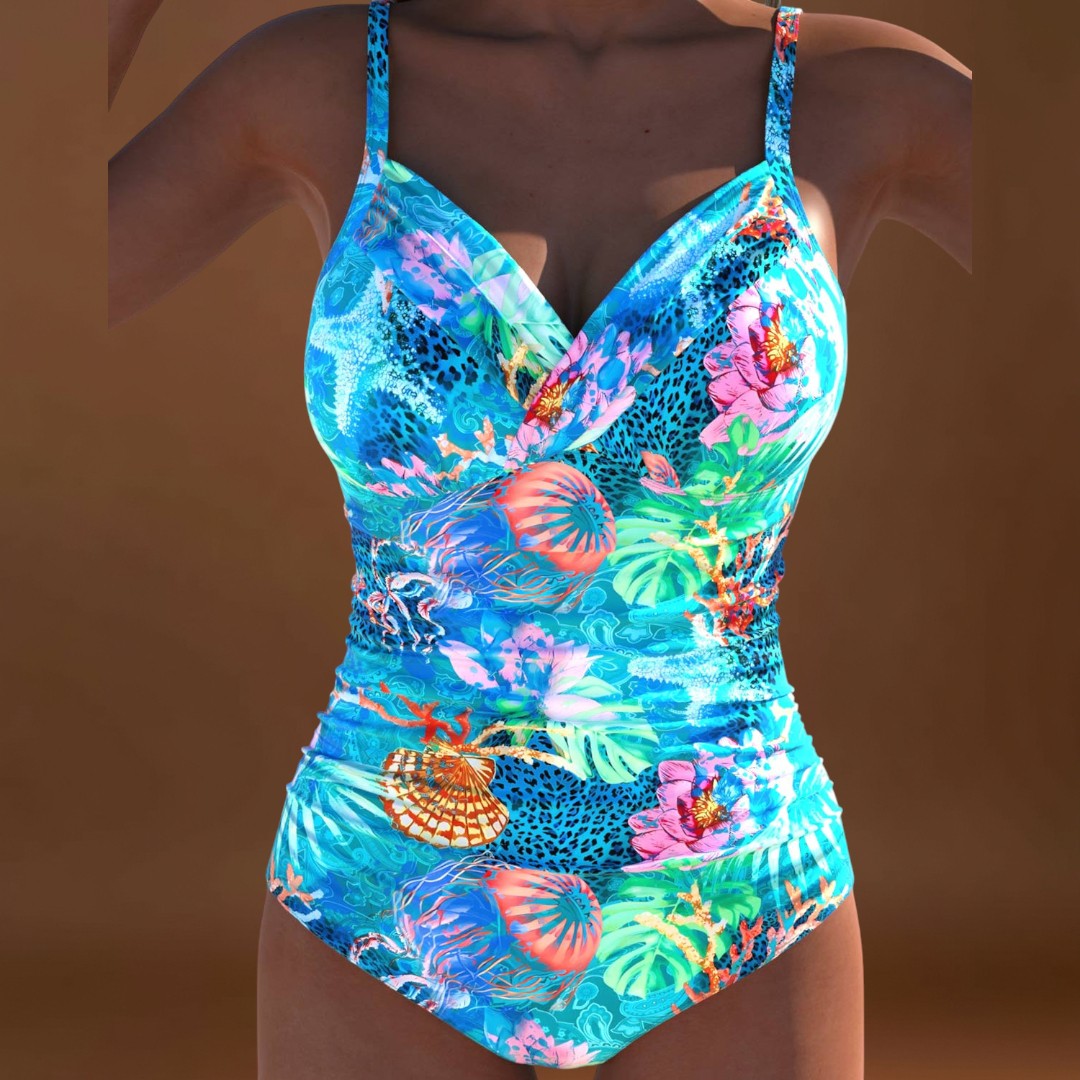 Com sua estampa tropical vibrante e pregas sutis na região da barriga, este maiô camufla exatamente onde você deseja. O decote em V acentua elegantemente o colo, enquanto os bojos macios e as alças firmes sustentam o busto. Perfeito para quem quer se sentir feminina e confiante – sem abrir mão de nada.