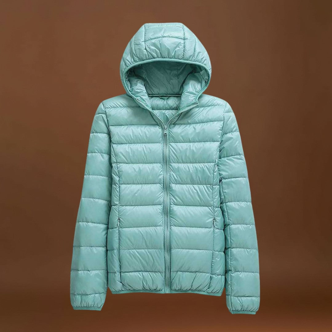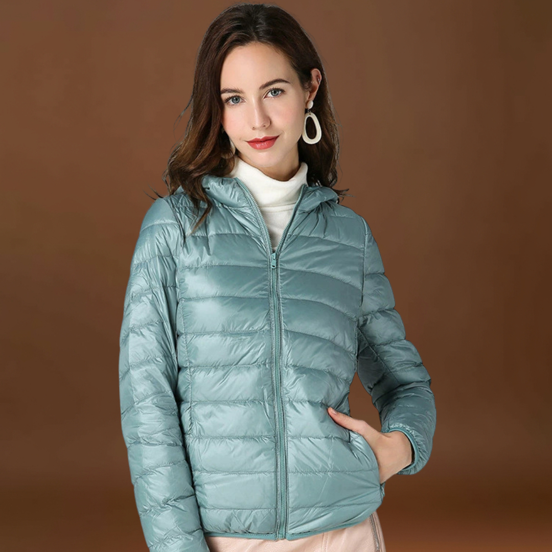 A tecnologia impermeável garante que fiques protegida de chuvas inesperadas, enquanto o enchimento suave em penas te mantém quente sem tornar o casaco volumoso. As pregas refinadas acrescentam um toque de elegância, tornando este casaco perfeito tanto para looks casuais como para conjuntos mais sofisticados.