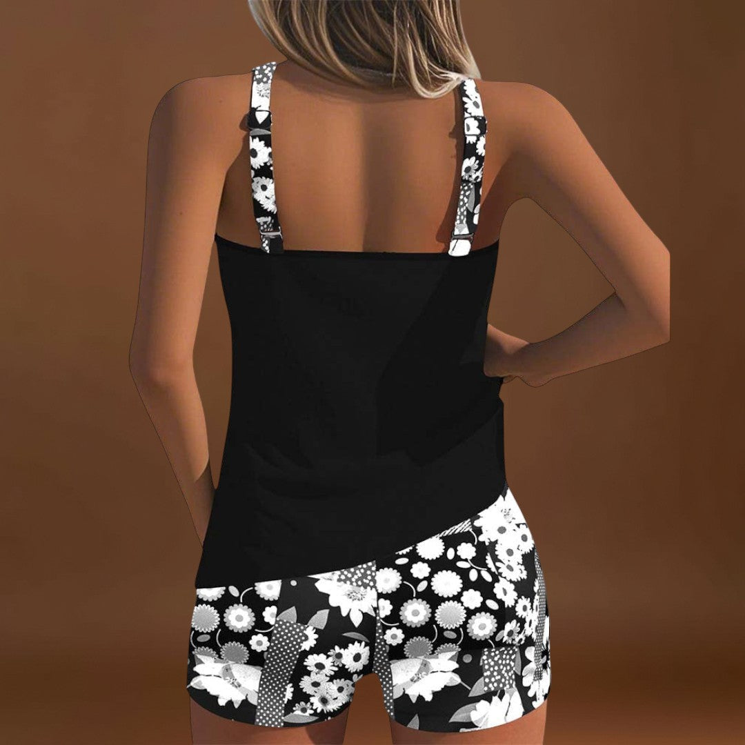 Este conjunto desportivo feminino em tons vibrantes combina estilo descontraído com máximo conforto. A camisola de alças oferece frescura e liberdade de movimentos, enquanto os calções estampados com padrão floral dão um toque alegre e moderno. Ideal para caminhadas, dias de praia ou momentos de lazer, é a escolha perfeita para mulheres que querem sentir-se bem sem abdicar do estilo.