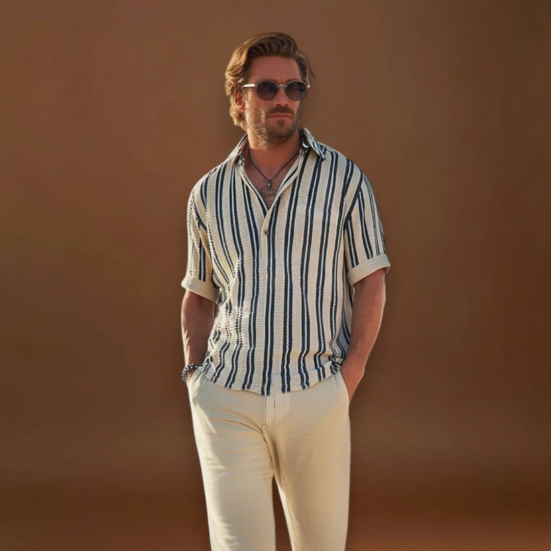 Esta camisa de manga curta tem um colarinho de lapela e um decote em V. O padrão listrado confere um aspeto arrumado, enquanto as mangas curtas permitem liberdade de movimento. A mistura de tecidos respiráveis ajuda à circulação de ar e visa manter a pele confortável em dias mais quentes.