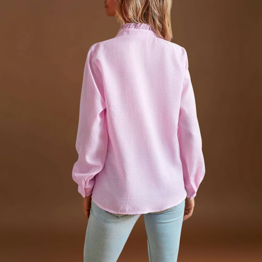 • Design elegante - O delicado pormenor do folho ao longo da linha dos botões confere um toque sofisticado e feminino, tornando-o adequado tanto para ocasiões casuais como formais.