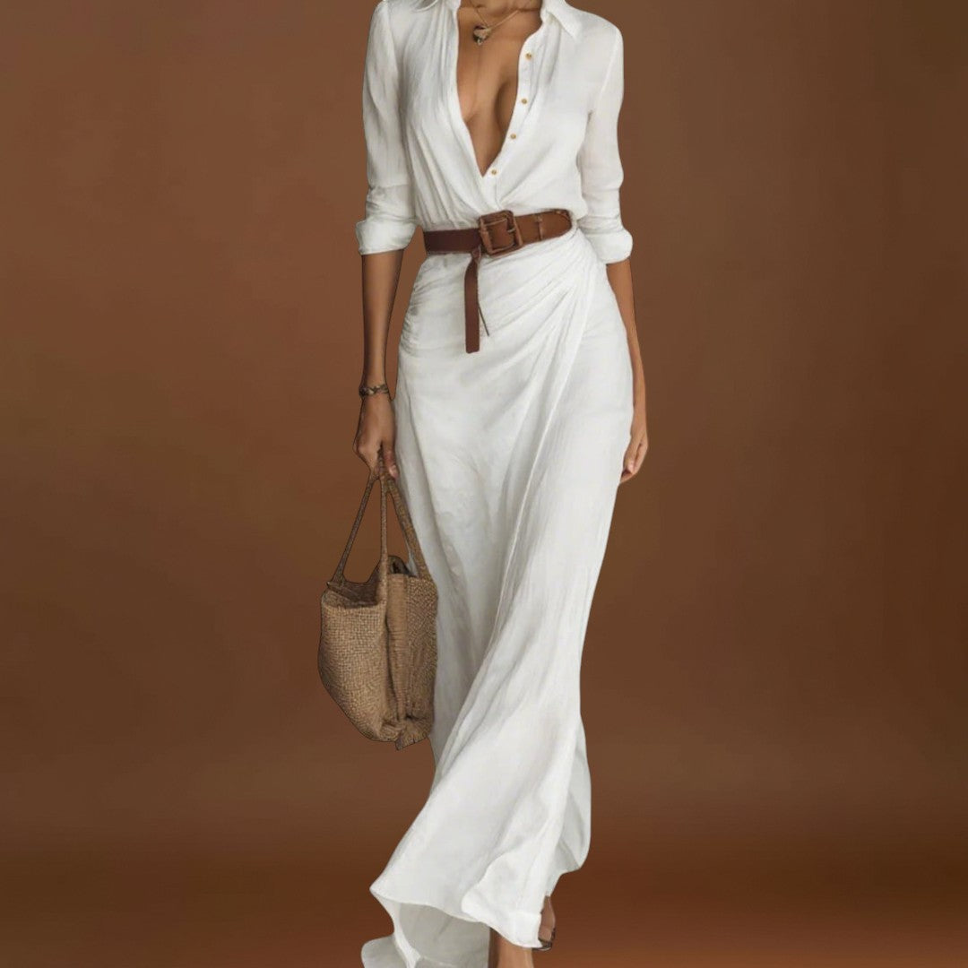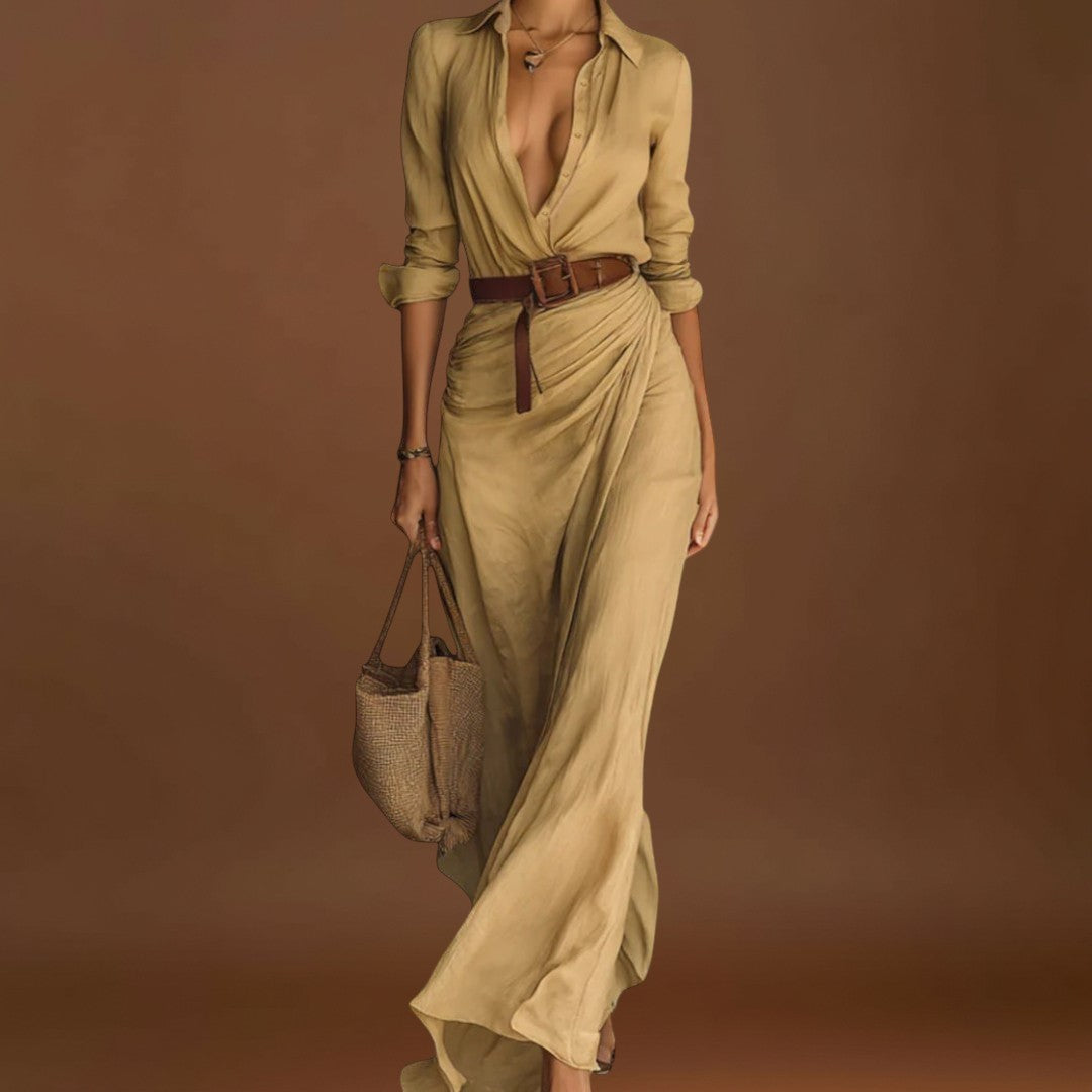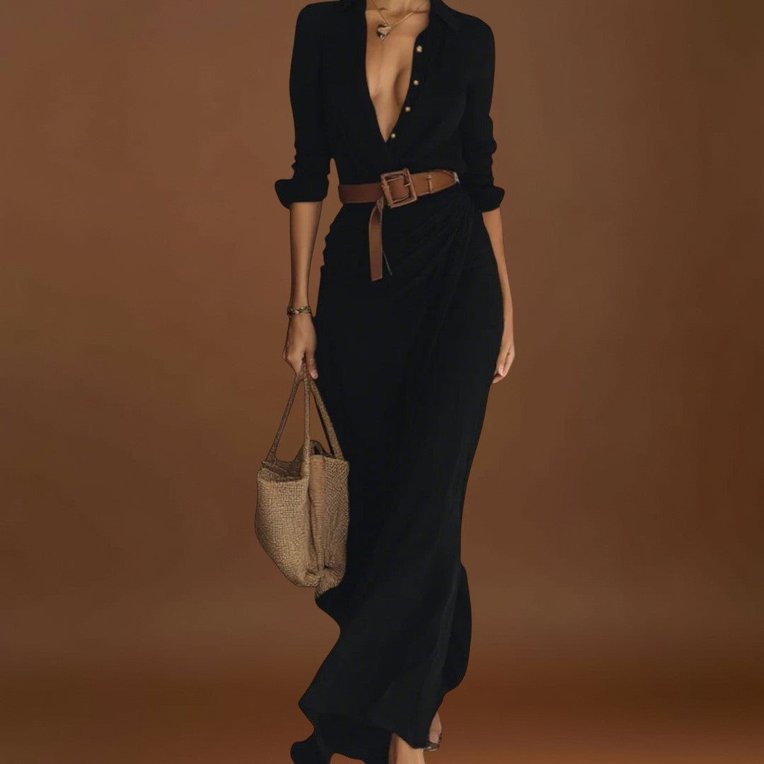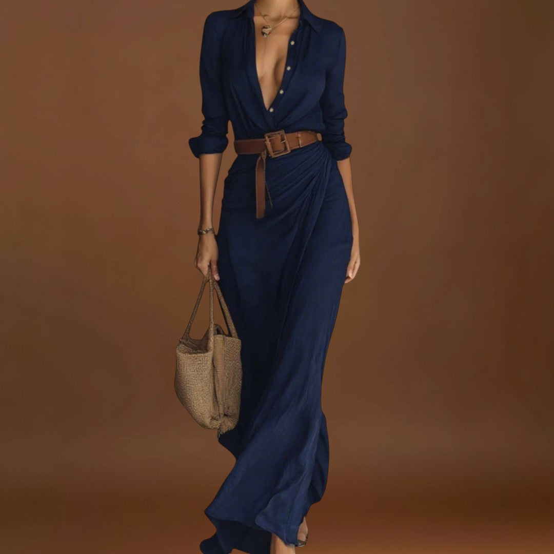 Este elegante vestido comprido destaca-se pelo cinto que realça a cintura, criando uma silhueta feminina e sofisticada. As mangas compridas com punhos dão-lhe um toque clássico e refinado, enquanto o corte fluido garante conforto e liberdade de movimento durante todo o dia. Perfeito para um look chique e elegante em qualquer estação.