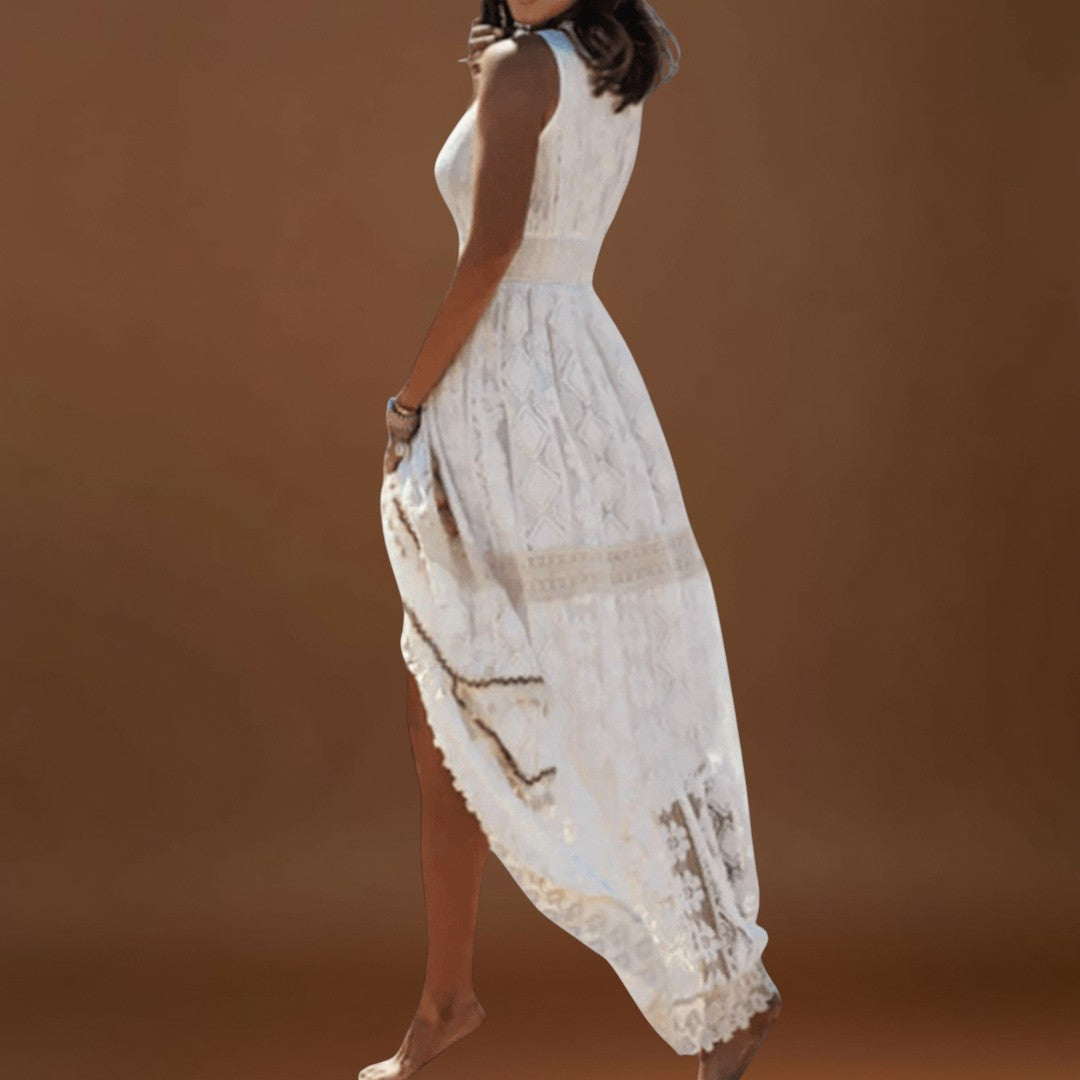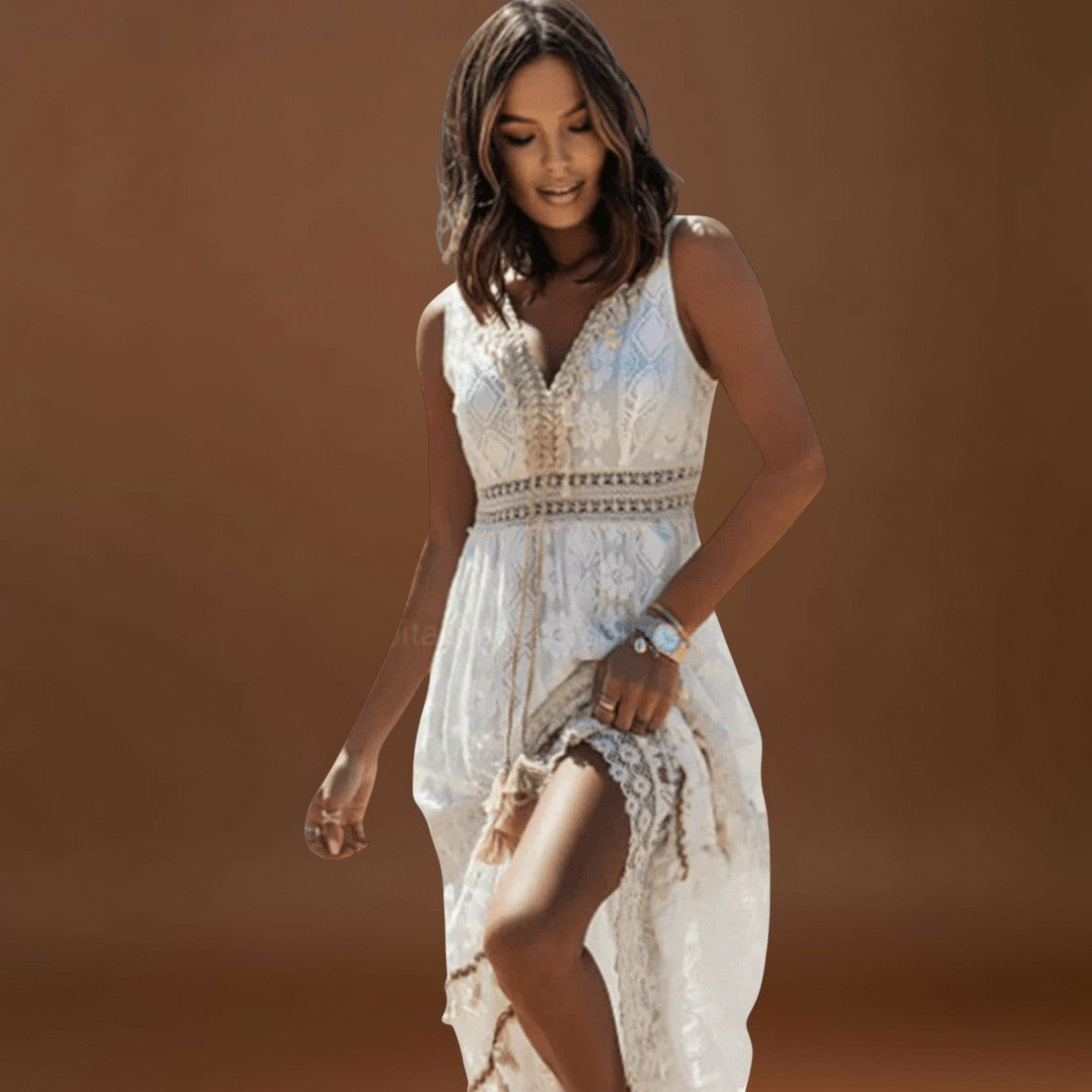 Sente a elegância descontraída do estilo boho com o nosso vestido maxi Érica. Perfeito para qualquer ocasião, combina uma silhueta fluida em linha A com delicados detalhes em renda, garantindo um visual sofisticado e relaxado ao mesmo tempo.